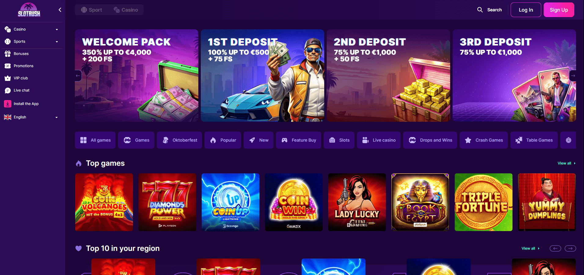 Biblioteca de jocuri de la SlotRush este ambițioasă, dar încă în creștere. Cazinoul își propune să ofere multe genuri și mii de opțiuni. Deocamdată, însă, există aproximativ 4.000 de jocuri, majoritatea fiind sloturi. Printre categoriile de sloturi disponibile se numără și cele cu funcție Cumpără Speciala sau cu Jackpot-uri. Descoperă mai jos top 5 sloturi populare de la SlotRush: